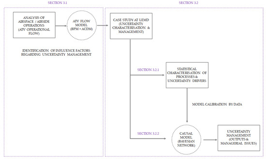 The analysis is divided into two steps. First, we develop a theoretical appraisal of the aircraft operation within the E-TMA, by characterising the processes and structuring the different timestamps. We generate a BPM, which is combined and quantified with the A-CDM milestone approach. This provides us with a conceptual framework for the practical analysis of the ATV flow (Section 3.1). The second part of the analysis is developed with a practical case study at Adolfo Suárez Madrid-Barajas (LEMD) Airport (Section 3.2). We characterise the uncertainty sources and assess the system’s time-efficiency performance. This is achieved by statistically evaluating the processes that were previously recorded in the first step and by also appraising the behaviour of uncertainty drivers (Section 3.2.1). After that, a probabilistic causal model is assembled to consider the interactions between different uncertainty explanatory variables (Section 3.2.2). The operational relationships that shape this model arise from the previous ATV flow framework. Figure 1 shows the proposed methodological approach for uncertainty management at the ATV (airspace/airside integrated operations). It summarizes the relationships among the different analyses and models described in Section 3.