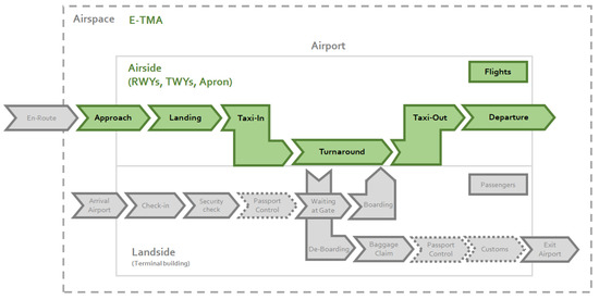 The evolution of a flight can be described as a sequential flow of events or processes [15,33,67]. Each of these events occurs consecutively, and if any of them are delayed, this may result in subsequent processes also being delayed (unless certain buffers or “slacks” are added into the times allocated to the completion of certain events) [6,16]. To analyse the evolution of the aircraft flow and the potential uncertainty propagation in the successive phases, this paper followed a “milestone approach” by assigning completion times to each event. This view, in line with the A-CDM method [68], allowed us to understand the operational performance and the potential saturation of the system. Saturation is here understood as the lack of capacity at the airport-airspace system level to “receive and transmit” aircraft flows according to a planned schedule. In the analysis, we used a spatial boundary associated with the E-TMA, which allowed us to consider inbound and outbound timestamps. This management boundary (airport centric limit of 200–500 NM) has already been implemented at multiple airports, with a horizon that ranges from around 190 NM for Stockholm to 250 NM for Rome and 350 NM for Heathrow [69]. The E-TMA (and not just the basic on-ground turnaround path at the airport that connects inbound and outbound flights) was selected to integrate uncertainty propagation in the airport system with global impacts in the air traffic network. This approach reflects the interaction between airport and airspace processes. The analysis focused on the aircraft flow– airside operations. Figure 2 illustrates the main processes that take place in the airport environment, using flights (up) and passengers (down) as flow agents. It describes the interaction between the airspace, airside and landside operations. Blocks highlighted in green refer to operations included in the spatial scope of the problem (aircraft flow at the airspace/airside framework). Over time, we restricted actions to tactical phases (day of operations) in order to consider the primary and initial inefficiencies of the system. The aim of the study was to describe a “visit” of an aircraft to the E-TMA (Figure 3), as an extension of the Single European Sky ATM Research (SESAR)’s ATV concept [9]. This “visit” consists basically of three separate sections [9]: