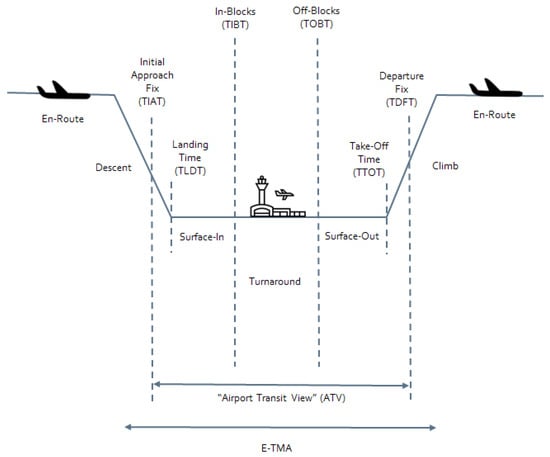 The Airport Transit View (ATV) concept describes the “visit” of an aircraft to the airport [9]. This framework connects inbound and outbound flights, providing a tool to optimise airport operations and to enable more efficient and cost-effective deployment of operator resources. It integrates airside operations (landing, taxiing, turnaround and take-off) and surrounding airspace operations (holding, final approach and initial climb) [3,10,11]. Moreover, the Airport Operations Plan (AOP) guarantees a common, agreed operational strategy between local stakeholders, providing knowledge about the current situation and detecting deviations [9]. It aims to achieve early decision-making and efficient management of the aircraft processes. In this sense, the Airport Collaborative Decision-Making (A-CDM) concept ensures that common situation awareness is reached between stakeholders [9]. Moreover, the implementation of the 4D-trajectory operational concept in future Air Traffic Management (ATM) systems will impose the compliance of very accurate arrival times over designated points on aircraft, including Controlled Times of Arrival (CTAs) at airports [12,13,14].