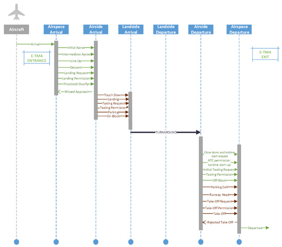 We employed Unified Modelling Language (UML) to graphically represent the BPM. UML is a visual modelling tool that can be used to create a pattern of a system [79]. The designed conceptual structure for the airspace/airside integrated operations is basically a UML sequence diagram (Figure 4). This framework allowed us to understand the relationships between processes in order to build the initial process model for the ATV flow and to characterise operational interdependencies in the subsequent causal model.