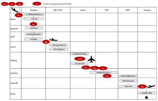 By combining the BPM and the milestone approach, Figure 5 shows a conceptual diagram for the E-TMA operational environment (airport-airspace stage). This diagram allows us to