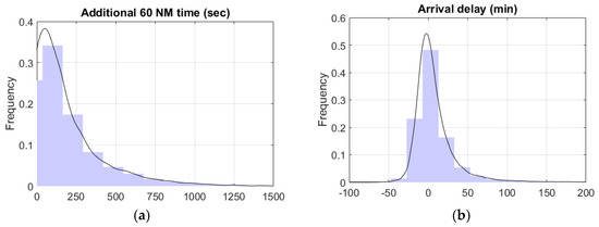 Histogram and distribution fitting for (a) additional time at ASMA 60 NM (s); (b) arrival delay (min).