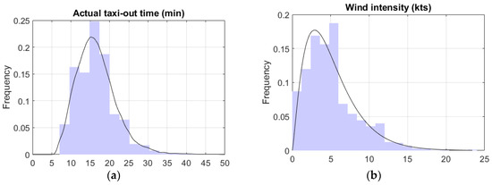 Histogram and distribution fitting for (a) actual taxi-out time (min) and (b) wind intensity (kts).