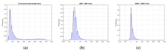 Distribution fitting has four main objectives: (a) to characterise the operational environment (e.g., duration and starting time for each process); (b) to appraise delays, uncertainties and their statistical behaviour; (c) to use probability distributions as a tool for dealing with uncertainty in order to make informed decisions and predictions (e.g., cumulative density functions can be used for allocating turnaround and buffer times); and (d) to model uncertainty sources when feeding the causal model that is developed later. As an example, Figure 9 shows the analysis for the turnaround stage (actual process length and in-block/off-block adherence) as it was found to be essential when assessing the system’s ability to absorb delays [16]. Although the sample was rather heterogeneous (a range of 746 min, due to aircraft parked overnight), almost 67% of its turnaround operations last less than 120 min. Thirty-four percent of operations fall within the interval from 30 to 60 min. The mean, median and mode for the turnaround’s length are 166 min, 78 min and 54 min, respectively. For the purpose of our paper, aircraft turnaround activities were treated aggregately as a “single” process or “black box”. This approach provided us with a “macro” view of aircraft turnaround operations and simplified the observation and modelling work needed to study interdependencies in the subsequent causal analysis [6].