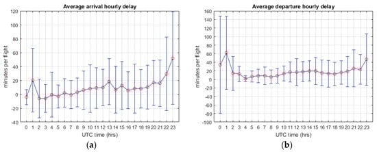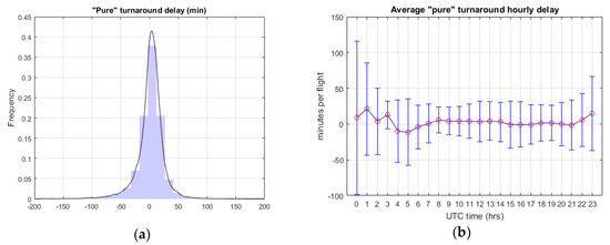 “Pure” turnaround delay (without considering the ATFCM delay): (a) histogram/curve fitting and (b) average hourly delay (min/operation) throughout the day (the error bars denote intervals of one standard deviation).