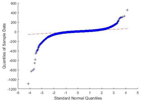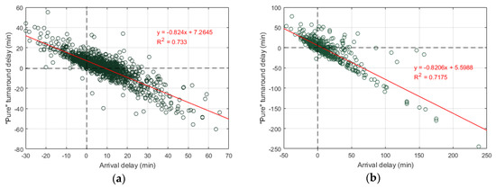 Figure 11 represents a plot of the quantiles of the sample data (“pure” turnaround delay) versus the theoretical quantiles values from a standard normal distribution. The plot appears linear between −2 and 2 times the standard deviation (95% of the distribution). Therefore, the metric related to “pure” turnaround delay was described with a normal distribution for reasonable operational times (−20 min to 100 min). The rest of the data can be understood as outliers (unusual operations) that distort the distribution.