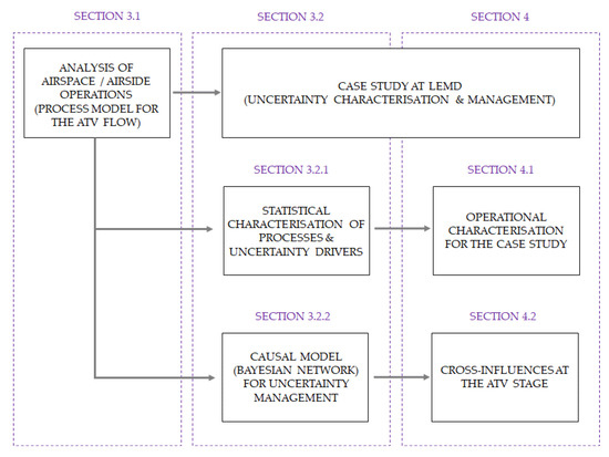 Uncertainty of operational conditions (e.g., runway configuration, aircraft performance, air traffic regulations, airline business models, ground services, meteorological conditions) makes airspace/airside integrated operations a stochastic phenomenon [15,16,17,18,19]. It is therefore necessary to define methodological frameworks to improve predictability and reliability of the airspace/airside integrated operations. Hence, the objective of the study is two-fold: (a) to analyse and characterise the aircraft flow of processes in order to understand the uncertainty dynamics; and (b) to generate a causal probabilistic model in order to manage uncertainty in the ATV environment.