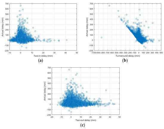Consequently, departure delays result from various reasons, such as “inherited” arrival lateness, delayed ground processes and/or disturbed ground operations. Interdependencies exist and may affect the delay chain. Existing reactionary delay may result in an even increased follow-up delay due to scarce resources at the airport [7]. We also considered four more measures that were already included in the main delays: (a) excess approach queuing time; (b) start-up delay (ASAT-TSAT); (c) push delay (AOBT-ASAT) and (d) Air Traffic Flow and Capacity Management (ATFCM) delay. The first one of these factors was included in the arrival delay, while the other three were included in the turnaround delay. The start-up delay assessed slowness in the scheduled start-up time, while push delay illustrates the difference in time between the actual start-up approval permission by the Air Traffic Controller (ATC) and the off-block operation. ATFCM delay is due to flow and capacity regulations in which aircraft are held on ground, preventing them from encountering airborne delays during which fuel is burnt and emissions are produced [80].