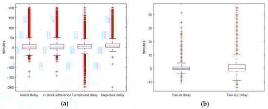 The data preparation phase covered all activities required to arrange the final dataset from the initial raw meteorological, radar and airport operational data, including locating and refining erroneous measurements. As shown in Table 3, the final dataset included information about airport infrastructure allocated to each operation, airline and aircraft characteristics, flight details, route origin and destination, operational times (milestones and duration of processes), regulations, causes of delay and meteorological features. Data regarding the aircraft and the flight (type, call sign and registration number) enabled us to link the inbound and outbound movements, assessing their “turnaround” operation (i.e., trace the airport–airspace integrated operations).