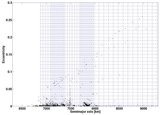 Example of the grid adopted in semimajor axis and eccentricity for the LEO region. The black dots represent the location of the satellites currently in space according to MASTER 2009.