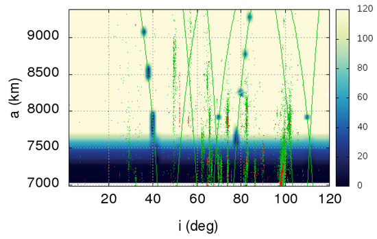 Figure 2 shows the location of the resonances determining the long-term behavior in LEO [7], superimposed on a residual lifetime map. The objects considered start from initially circular orbits and have an area over mass ratio m/kg. The dark blue regions at the bottom of Figure 2 correspond to residual lifetimes compliant with the 25-year rule [8]. The small green and red dots show the location of all the objects present in the MASTER 2009 population.