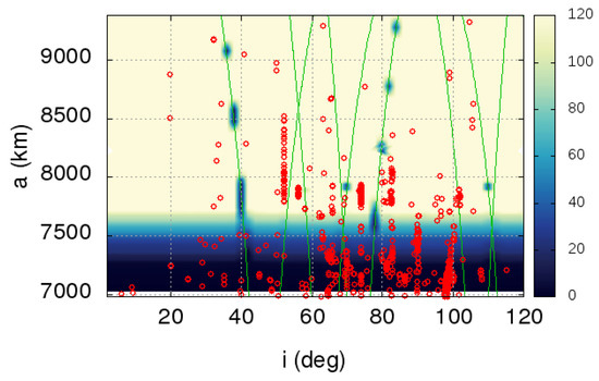 - Skoulidou, D.K.; Rosengren, A.J.; Tsiganis, K.; Voyatzis, G. Cartographic study of the MEO phase space. In Proceedings of the 7th European Conference on Space Debris, Darmstadt, Germany, 18–21 April 2017. [Google Scholar]