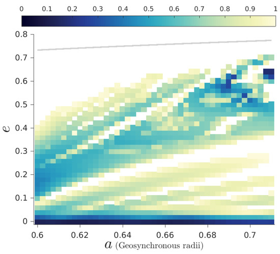 Maximum eccentricity map for circular medium Earth orbits with inclination , in the GNSS region. The white regions indicate that the eccentricity needed to re-enter into the atmosphere is reached within 120 years. An m/kg is assumed.