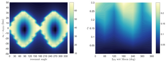 For the GEO region, both the geosynchronous equatorial orbits and the highly inclined geosynchronous orbits (e.g., used recently by the Chinese Compass system) were explored. In the former case, whereas natural re-entry solutions cannot be found, stable graveyard orbits were identified. The map in Figure 5 (left panel) shows the maximum variation in semimajor axis of the graveyard orbits around the geostationary altitude. The right panel of Figure 5 alternatively shows the maximum eccentricity variations reached by a spacecraft starting from an inclined GEO, mainly due to lunar perturbations [3]. A significant increase in the orbital eccentricity can be noticed for these cases, paving the way to possible disposal manoeuvres, even from these high Earth orbits.