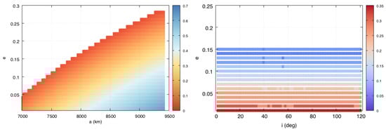 As the next step in the project, the end-of-life disposal manoeuvres needed to exploit the natural dynamics, revealed through the long-term orbit evolution maps, the analytical resonance study and the frequency analysis briefly described above, were computed (e.g., [9] for the LEO part). The main novelty of ReDSHIFT is that the natural dynamics are enhanced via impulsive manoeuvres, solar and drag sailing and a combination of manoeuvre and solar and drag sailing. The end-of-life manoeuvre requirements need to be designed based on mission characteristics such as the available on-board propellant and the area-to-mass ratio of the satellite. Exploiting the developed methods, it is possible to determine the optimal re-entry or graveyard orbit, given an available on board the satellite. Slightly different design strategies are followed for the LEO, MEO and GEO environment. The strategy followed for disposal in LEO consists in computing the possible displacements in (a,e,i) for a given provided in input, in order to identify the most suitable final orbit that can be achieved with that . The maximum considered for the simulation is the one corresponding to a direct re-entry manoeuvre down to 80 km of altitude. The maximum value of considered for the simulation is the one corresponding to a direct re-entry manoeuvre down to 80 km altitude. In this way, all the possible target orbits are selected and, among them, the one that will naturally evolve toward re-entry in a time less than 50 years is chosen. For all these cases, the required is computed as a single burn manoeuvre in case the two orbits are intersecting. As an example, Figure 6 shows the solutions for re-entry from low-Earth orbit, the colour bar represents the requirements.