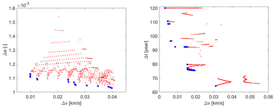 Example of solutions for re-entry and graveyard solution from GEO [10]. Left panel: Pareto front for graveyard solutions for equatorial GEO orbits. Right panel: Pareto front of re-entry solutions from inclined GEO orbit.