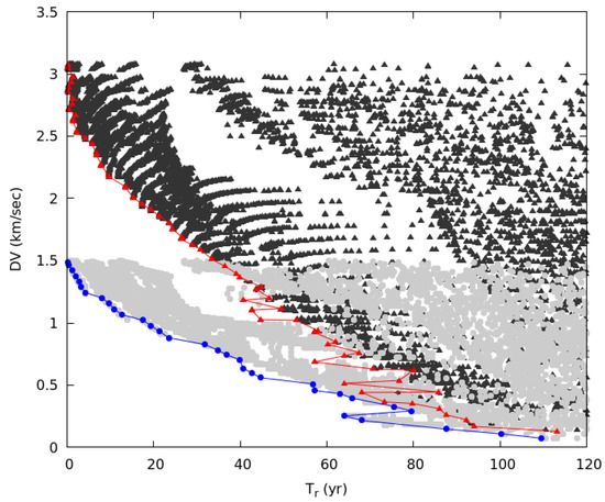 An example of the Pareto front solutions for re-entry orbit from MEO is instead shown in Figure 8. For all 1-burn (dark triangles) and 2-burn Hohmann (light grey point) manoeuvres found. The blue/red curve is the Pareto front. A number of possible solutions with m/s and years can be seen.