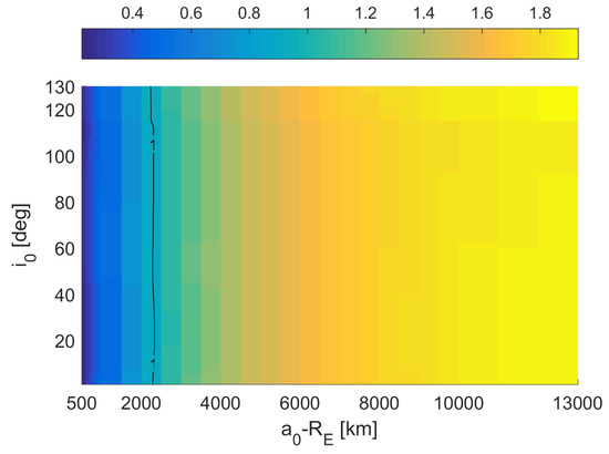Requirements in terms of effective area-to-mass (i.e., ) for different deorbiting times with modulating solar radiation pressure strategy. The colour bar represents the required effective area-to-mass.