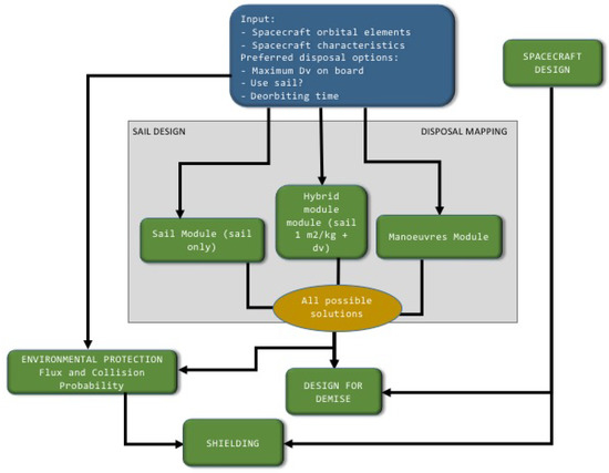 The core of the software is represented by the modules allowing the computation and characterization of the disposal trajectory for a given spacecraft at the end-of-life. In the disposal module, given the initial orbit of the spacecraft and the spacecraft characteristics in terms of its cross area and mass, the optimal options for end-of-life disposal are given and compared. The end-of-life disposal can be attained either via one or a sequence of impulsive manoeuvres or through the use of a solar/drag sail or through a hybrid sail and manoeuvre approach. This module is based on a study of the natural orbit evolution in the low to medium and geostationary regions that was performed to identify long-term stable orbits or resonance conditions to be used as graveyard or re-entry trajectories. The optimal manoeuvre to reach such re-entry or graveyard conditions is calculated. If the re-entry can be enhanced through a sail, different strategies for sail attitude control can be selected. The optimal disposal by this module is passed to the space environment module so that the effect of this disposal on the space debris environment is calculated. This is done based on precomputed long-term simulations of the whole space debris environment, under different scenarios, to be used for the computation of the collision risk for the spacecraft in the disposal phase. In the case that the disposal trajectory is a re-entry one, the conditions of the orbit at 120 km are used to verify the demisability of the spacecraft. This is done, by default, using some predetermined spacecraft configuration but the external user can also load a preferred configuration.