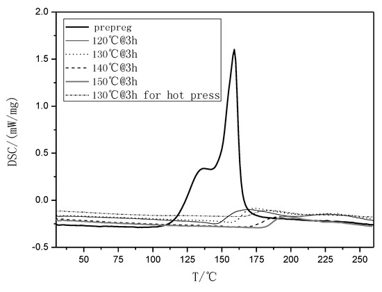 In this study [7,8], an anhydride-type epoxy curing agent, maleopimaric (Scheme 1), was synthesized as a hardener from rosin acid (Scheme 1). This was supplied by the Ningbo Institute of Materials and Technology Engineering. A resin mixed with an E51-type epoxy and a solid phenolic epoxy was then prepared as the main component, together with an accelerator mixed of two amino imidazole salts as the thermally latent curing agent and also as the catalyst for the anhydride. The experimental details can also be find in reference [7]. Figure 1 exhibits the glass transition behavior of the formulated resin system. As shown, the curing degree increased with the curing temperature for a constant curing time of 3 h, as well as the glass transition temperature. The formulated matrix resin was finally designated as AGMP3600, with a bio-content of about 30%.