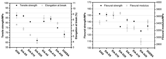 Mechanical properties of the cured EP resins. EIA0 and DGEBA refer to the cured samples without comonomers; D and A denote the DVB (divinyl benzene) and AESO (acrylated epoxidized soybean oil) co-monomers, respectively.