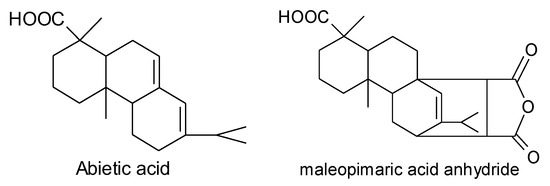 Rosin is an abundantly available natural product, it is nontoxic and odorless, and contains various isomerized acids (>90%) and some neutral substances [5]. Reactive double bonds and carboxyl groups of rosin acids render them suitable for the Diels–Alder reaction, esterification and condensation reaction usage. Therefore, rosin acid has received increasing attention as a bio-sourced form of renewable feedstock in polymer science.