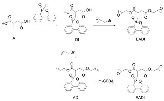 Given the presence of double bonds in itaconic acid and the low flame retardancy of EP resins, a flame-resistant DOPO (6H-dibenz(C,E)(1,2)oxaphosphorin-6-oxide) was chemically incorporated into the itaconic-acid-based EP resin, and a phosphorus-containing EP resin (EADI) was obtained (Scheme 4). The property study showed that the cured EADI network presents a comparable glass transition temperature and mechanical properties to those of the DGEBA system. In addition, excellent flame retardancy capacities with the UL94 V-0 grade used during vertical burning tests were observed for the EADI system. EADI may be used as a bio-based candidate for EP flame retardancy [12].