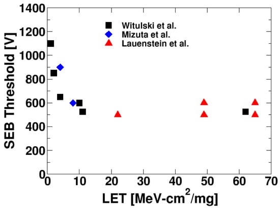 The devices tested by Witulski et al. [] and represented by the data points in Figure 1 have a chip size of approximately 2 mm by 3 mm. Since the cross-section for SEB is not known from experiments, a simple approximation is made based on the chip area (6 × 10−2 cm2). However, the entire chip is not sensitive. In addition, the time when the device is reverse biased is less than 100%. Taking the sensitive area as 50% of the die area and the duty-cycle to be 50%, this reduces the effective cross-section, independent of LET, to