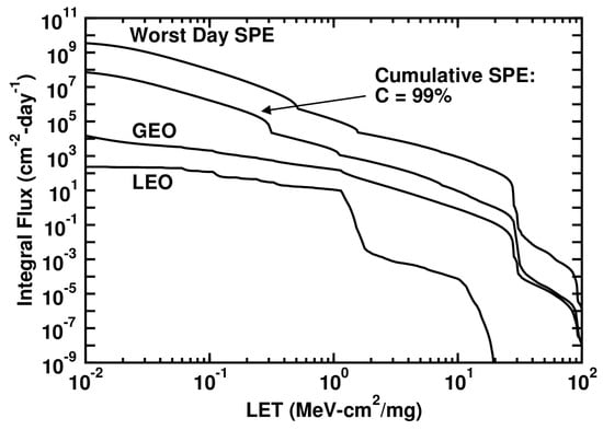 Worst day solar particle event (SPEW) from CREME96 []. GEO and LEO are solar minimum spectra from CREME96 []. Cumulative solar particle event spectra at the 99% confidence levels after Xapsos et al. []. Results for 100 mils aluminum shielding. GEO—geostationary orbit, often referred to as a geosynchronous equatorial orbit (GEO); LEO—low Earth orbit, common usage in discussing satellites.
