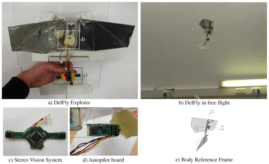 Overview of the DelFly Explorer. (a) shows the 28-cm wingspan 20-g FWMAV in detail; (b) shows the DelFly Explorer during slow forward flight and visualizes the high pitch angle at this speed; (c) shows a close-up of the four-gram stereo vision system. It uses a Complex Programmable Logic Device (CPLD) to merge images and an STM32F4 to process the images; (d) shows a close-up of the 0.9-g autopilot board; the autopilot uses an 8-bit micro-controller and MPU9050 IMU; (e) shows the definition of the body axes of the DelFly.