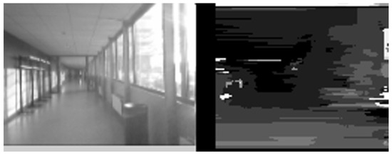 The disparity maps from the stereo vision algorithm are used directly for control purposes. Tests with the algorithm showed that the matching quality is very bad when the cameras are close to a wall with poor texture. This is illustrated in Figure 4, which shows an image of a corridor and the corresponding disparity map. In this case, the wall is particularly complex to process since the wall is curved. A solution to this problem is to use the matching certainty as a measure to detect image regions with very poor stereo correspondence. The matching certainty is defined as: