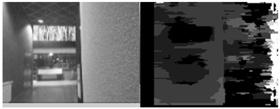 Result of the implemented stereo vision method (based on [29]) on images of a corridor with a curved wall with little texture on the right side. The disparity map gives a poor result on the right side.