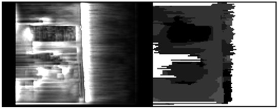 is the matching cost for a certain disparity. Only if the certainty c of a pixel is above a threshold , it is considered to be reliable. The disparity image is updated according to this uncertainty. For each image line, the algorithm checks which pixels, starting from both the left and right border, are regarded as unreliable. As soon as a reliable pixel is found, all disparities up to that point in the disparity image line are discarded. Figure 5 shows the reliability of all pixels (left) from Figure 4 and which pixels are regarded as uncertain based on . A second method is used to cope with wall regions that are considered to be reliable, but that are actually wrong. Since the matching performance of stereo vision algorithms relies on image texture, a simplified form of linear edge detection is used. Edge detection is based on the intensity difference of neighboring pixels: