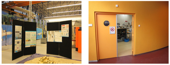 Experimental setup for flight tests with an opened door on the left. The gap between the black walls is 80 cm. The right image shows a real door used for testing.