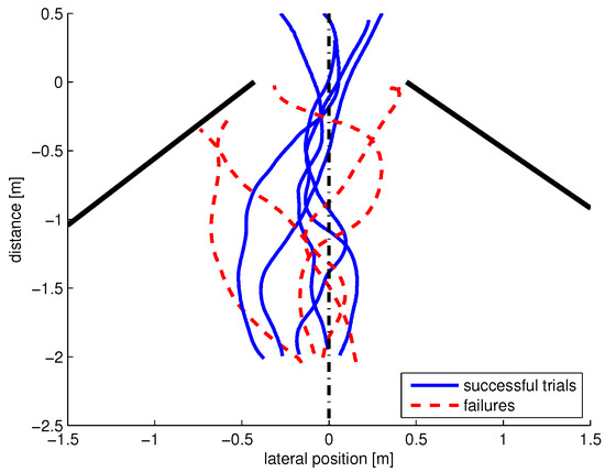 Ground truth data of flight trajectories from tests where the DelFly was intended to fly through a simulated ‘door’ inside a motion tracking flight arena. The door is formed by two walls, indicated by the thick black lines on the side. The width of the door opening is 80 cm (see the left image in Figure 6). The DelFly starts each trial around the −2 m line. The vertical line indicates the middle line. Five successful trials are depicted and four failures. In three failures, the navigation would aim too close to the edge of the door. In one case, a bad detection or lack of texture is expected to have played an important role.
