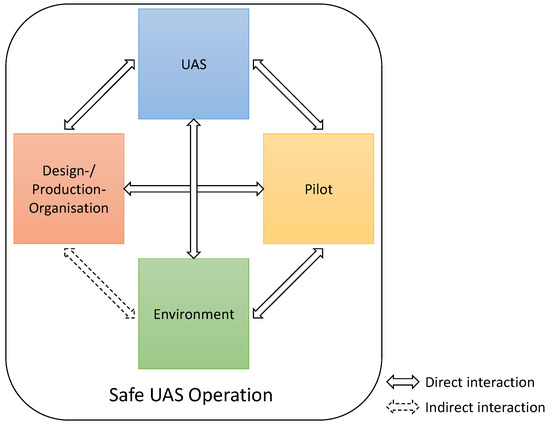 Figure 1 shows the basic interaction of aspects that influence safe UAS operation. The design/production organisation with its production processes directly influences the quality of the UAS operated by the pilot. Furthermore, it influences the pilot by the quality of the associated operation manuals. The pilot can only operate a UAS safely if the UAS is of good and safe design and if he or she has the appropriate manuals and sufficient expertise. Both the UAS and the pilot affect the environment directly with their operation, especially in case UA crashes, whereas the designer/producer does this only indirectly but foremost also if the UA crashes because of bad design. The supervision and creation of regulations that enable the safe operation of UAS that are not deemed airworthy but safe enough to fly are obliged to the competent authorities, as was done by EASA and proposed in [6,7,8,9]. The entire regulation approach can be summarized into four central requirement aspects: