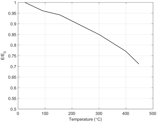 Vosteen [39] showed that it is appropriate to use the dynamic reduction in Young’s modulus with varying temperature for aeroelastic structures. The variation is shown in Figure 2. In the current work, this method is developed for determining the equivalent stiffness reduction in , and that represents the structural stiffness reduction due to the applied temperature loads. The dynamic modulus E is defined as a function of the oscillating frequency, :