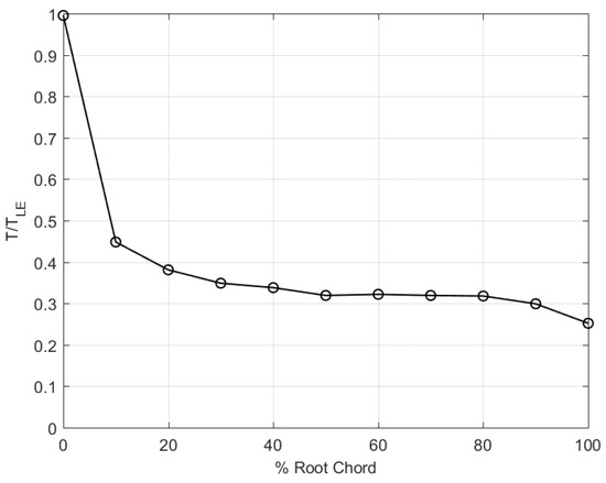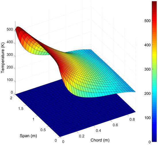 where k is the thermal conductivity of the surrounding medium, is the kinematic viscosity, is the airspeed, x is the characteristic length and is the Prandtl number. The model assumes a constant airspeed; however, it updates the temperature of the surrounding medium to uphold the energy balance (). Figure 4 shows the evolution of the temperature distribution after 1 s based on the initial conditions defined by the temperature distribution curve in Figure 3. Note that the distribution is for the entire span to have symmetry on the wing’s root plane. As expected, the leading edge is hottest due to stagnation conditions ( K), with the temperature dropping by over at the trailing edge. If one looks at Figure 2, there is a 70% difference between leading and trailing edge temperature. Figure 4 shows that thermal equilibrium is being achieved, as the temperature difference between leading and trailing edge after 1 s is .