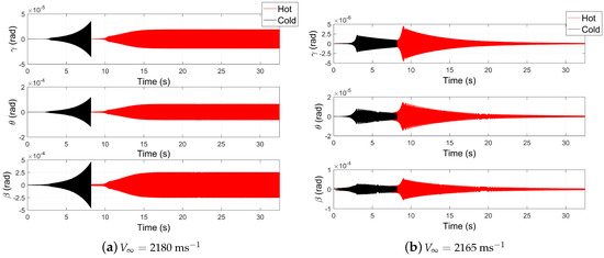 Figure 8a shows that the cold wing response is unstable, as the response magnitude grows exponentially, whereas the response of the hot wing is undergoing limit cycle oscilations. Similarly, Figure 8b shows the dynamic response of the wing at an airspeed of 2165 ms.