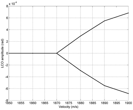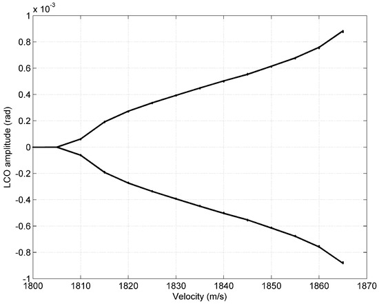 As the system is nonlinear due to the aerodynamics, flutter does not appear until the flow exceeds an airspeed of 2240 ms , with limit cycle oscillations appearing at an airspeed of 2170 ms . Figure 7 shows the bifurcation plot for the cold wing.