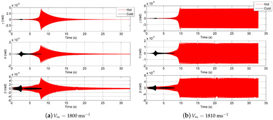 Figure 10a shows the dynamic response of the wing at a flight speed of 1800 ms. The wing passes though its first resonance under forced excitation before the wing is allowed to respond at its free behaviour, thus showing a decaying behaviour. The hot wing oscillations decay at this flight velocity, as seen in Figure 10a; however, the magnitude of the response is greater compared to the cold wing. The change in natural frequency is clearly seen from the different location of the maximum response of the wing. The cold wing has higher damping than the hot wing. At a flight speed of 1810 ms (Figure 10b), the hot wing is now undergoing limit cycle oscillations, as the wing is oscillating between two bounded magnitudes, seen in Figure 10b, while the cold wing is presenting a decaying behaviour. Comparing the hot response to the cold wing shows that, at this velocity, under no heating, the oscillations of the wing decay and thus is dynamically stable. In all cases, the control degree-of-freedom provides the largest response, of course all degrees-of-freedom being coupled, they all follow the same structural response, albeit at different amplitudes and frequencies. By looking at these responses, the negative impact that the heat load has on the dynamic behaviour of the wing is evident.