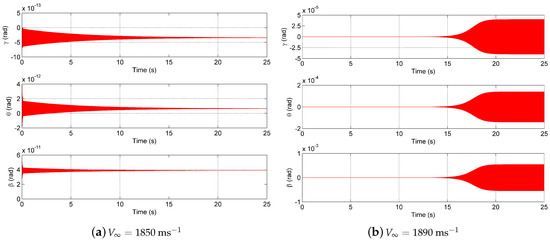 Figure 12a shows the significant reduction in the magnitude of the response compared with the steady-state load case. This further emphasises the increased damping of the system. The response of the transient load case at a flight speed of 1890 ms is given in Figure 12b. At this speed, the time varying hot wing is undergoing limit cycle oscillations, as the wing is oscillating between two bounded magnitudes. The response is significantly slower when compared with the steady-state case in limit cycle oscillations. This is seen by the time taken for limit cycle oscillations to begin, about 20 s compared to 10 s for the steady-state case.
