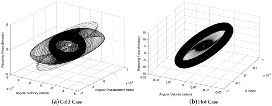 The stiffness restoring force is increased with increased displacement, showing maximum values of Nmrad. The stiffness in this displacement range displays a linear behaviour. Figure 13b shows the restoring stiffness for the hot case. It should be noted as well that damping restoring force is increased by an order of magnitude. The restoring stiffness for the hot case shows a similar behaviour to that of the cold case—this is seen by comparing Figure 13a,b, however with a larger magnitude, Nmrad, compared with Nmrad. This increased restoring stiffness confirms the reduction in the limit cycle oscillation velocity range for the hot cases.