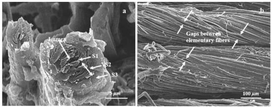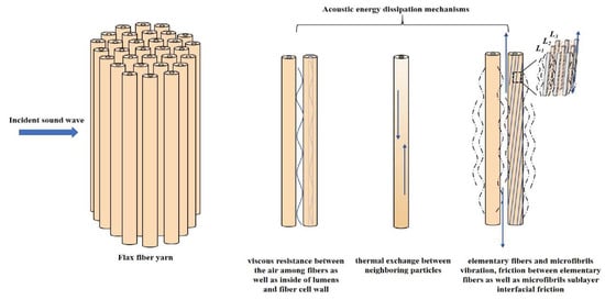 Zheng and Li [3] found using plant-fiber-reinforced composite (PFRC) as skins of sandwich structures processes better sound absorption properties than using glass-fiber-reinforced composite (GFRC) as skins. The damping properties of flax-fiber-reinforced composite (FFRC) face sheets and GFRC face-sheet-based sandwich structures were compared by Petrone et al. [4,5]. Their research results indicated that FFRC face sheet sandwich panels have outperformed energy dissipation ability compared to the synthetic fiber face sheet ones. Sarginis et al. [6] investigated the sound and vibration damping characteristics of balsa-core-based sandwich beams. They found that the coincidence frequency of sandwich beams with natural fiber facing sheet and balsa core was tripled compared to a synthetic-core-based sandwich beam. Plant fiber is a kind of natural material, and it has been widely used as reinforcement in composite structures for the last decades due to their rich source, low price, specific strength, high specific modulus, and so on. Plant fiber has a complex, multiscale, hollow structure compared with synthetic fiber [7,8]. For example, flax fiber is extracted from the stalk of the plant, and the characteristics of its natural growth result in its multiscale structure, which can be simplified at two scales. At the mesoscopic scale, a bundle contains 10 to 40 elementary fibers (12–16 μm in diameter, 2–5 cm in length) which are linked together mainly by pectin. At the microscopic scale, different from the solid structure of synthetic fiber, each elementary fiber is made up of concentric cell walls called the primary cell wall (0.2 μm) and the secondary cell wall. The secondary cell wall is composed of three layers, namely the S1 layer (0.08–0.2 μm), the S2 layer (1–10 μm), and the S3 layer (0.1 μm). Most of the cellulose microfibrils are located in the S2 layer, which is a type of polymer and possesses viscoelastic properties. The S2 layer of flax fiber consists of numerous cellulose microfibril sublayers (L1, L2… Ln) which run parallel to each other and form a microfibril angle with the fiber direction. At the center of the elementary fiber, there is a 2–5-μm diameter small open channel called lumen, as revealed in Figure 1a. It can be seen from Figure 1b that hundreds of elementary fibers twist together to form a continuous yarn, and a gap of dozens of microns is between each elementary fiber. The unique microstructure brings many distinctive advantages for plant fiber, such as superior energy absorption [9], acoustic [10] and damping [11] performances, etc. Natural fiber was found to be a good acoustically absorbent material due to the hollow structures which efficiently convert acoustic energy into mechanical and heat energy [12]. The investigations on the acoustic absorption properties of natural-fibrous-material-reinforced composites are limited; however, several scholars have experimentally studied the sound absorption coefficients of plant-fiber-reinforced composites (PFRC) and found their sound absorption coefficients (SAC) were much higher than those of the synthetic-fiber-reinforced composites at 100–2000 Hz frequency level [12,13]. Yang and Li [14] also found that the Garai–Pompoli model and Delany–Bazley model have good agreement with the experimental results. However, the acoustical dissipation mechanisms of plant fiber materials were not plenarily analyzed in these studies and the multiscale hollow structure of plant fibers was not reflected by these two models. Therefore, the multiscale structure of plant fiber should be considered during sound absorption mechanisms analysis as well as the acoustic properties prediction. Olny and Boutin [15] theoretically studied the acoustic wave propagation in media with two interconnected networks of pores of very different characteristic sizes. In this study, flax fiber yarn was considered as a double-porosity media, and this double-porosity model was employed to predict the acoustic properties of flax fiber.