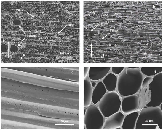 SEM micrographs of balsa wood (a) cross-section; (b) longitudinal view; (c) micropores on fibers; and (d) multilayer cell wall. L, R, and T refer to the longitudinal, radial, and tangential axes of symmetry.