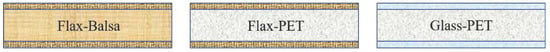 The epoxy resin, curing agent, and accelerating agent were mixed at the weight ratio of 100:80:1. Initially, 12 layers of flax fiber fabrics and 24 layers of glass fiber fabrics were impregnated with the resin system and laid inside of a steel mold in stacking sequence of [0/90/0]2s and [02/902/02]2s, respectively. In addition, 6 layers of impregnated flax fiber fabrics were laid on the top and bottom of the core material with stacking sequence of [0/90/0]s in order to fabricate flax-fiber-reinforced composite (FFRC) skin-based sandwich panels. A similar process was used for GFRP skin-based sandwich panels (12 layers on each side, [02/902/02]s). The resulting laminates and sandwich prepreg systems were then respectively placed in a hot press machine under pressure of 1 MPa and temperature of 120 °C for 2 h for complete curing. Two types of composite laminate, being flax-fiber-reinforced composite (FFRC) and glass-fiber-reinforced composite (GFRC), with mean thickness of 4 mm and fiber volume fraction of 50% were manufactured. Three types of sandwich structures, Flax-Balsa, Flax-PET, and Glass-PET, with 2 mm thickness and 50% fiber volume fraction of composite skin on each side were manufactured, in which Flax-Balsa and Flax-PET denote sandwich structures based on FFRC skins and balsa or PET foam cores, respectively. The thickness of the balsa panel was on the tangential direction of the balsa wood. The Glass-PET denotes a sandwich structure with GFRC skins and PET foam core, as illustrated in Figure 3.
