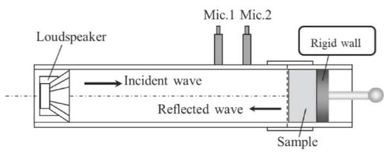Sound absorption measurement was performed using the impedance tube method. The sound absorption coefficient (SAC) of sandwich composites was measured through a transfer function technique with the impedance tube facilities manufactured by BSWA Technology Co. Ltd., Beijing, China. The SAC is defined as the ratio of the absorbed sound energy and the incident sound energy. The measurements were conducted according to ISO10534-2 standard at medium to high frequencies from 250 to 10,000 Hz at 25 °C and 60% relative humidity, and at least three specimens were tested for each group. The measurements were composed of SW422, SW477, and SW499 impedance tubes with diameters of 100, 30, and 16 mm for measuring frequencies from 250–2000, 800–6300, and 2500–10,000 Hz, respectively. Samples were backed up by a rigid wall which reflected all the incoming sound energy. Two microphones were mounted at the wall of the tube to measure the sound pressure. Therefore, if the incident sound energy was known and the transmission sound energy could be measured with the aid of the transfer function, the sound energy absorbed by the materials could be obtained, as illustrated in Figure 4.