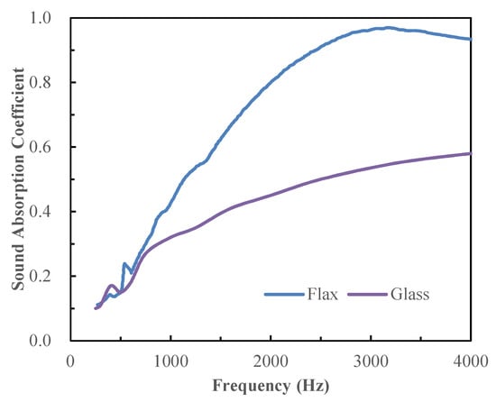 The tested sound absorption coefficients of unidirectional flax fiber fabric and glass fiber fabric are presented in Figure 5 as a function of frequency. The results show that in the test frequency range of 250–4000 Hz, flax fiber fabric has superior acoustic absorption ability compared to glass fiber fabric. It can be seen from Figure 5 that the SACs of flax fiber fabric were higher than 0.5 when the sound wave frequency was over 1000 Hz, which means over half of the incident sound energy was absorbed by the fabric. In this study, the critical frequency of flax fiber fabric was 3200 Hz, which means the SAC reached a peak value of 0.96 at 3200 Hz and showed a relatively stable sound absorption ability afterwards. Clearly, the maximum SAC of glass is much lower than that of the flax fiber, only 0.58 in the test frequency range, and the critical frequency is higher than that of the flax fiber (>4000 Hz). This means flax fibers process not only outstanding sound absorption capability but also wider sound absorbing frequency range.