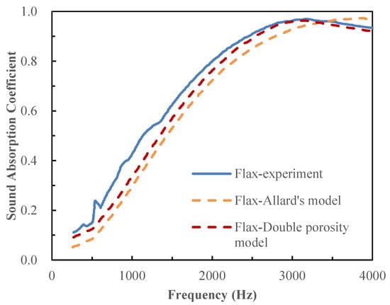 It can be found from Figure 7 that the double-porosity model showed more accuracy predicting results compared to the Champoux–Allard model [22], and the critical frequency of flax fiber fabric was accurately estimated. This indicates that the main factors affecting the sound absorption properties of plant fiber materials are not only fiber diameter, density, and fabric density, but the lumen diameter is also an important parameter. The double-porosity model can be used to predict the sound absorption coefficients of plant fibers effectively.