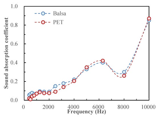 The experimental sound absorption coefficients of balsa and PET foam with frequency.